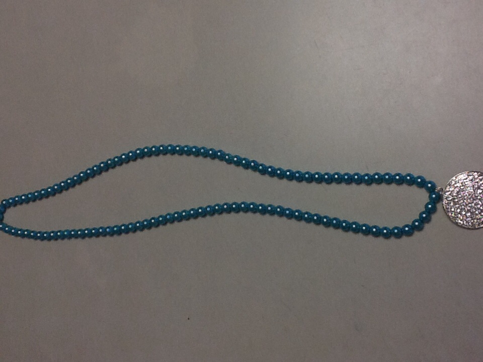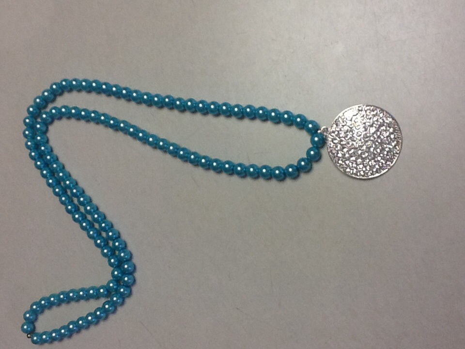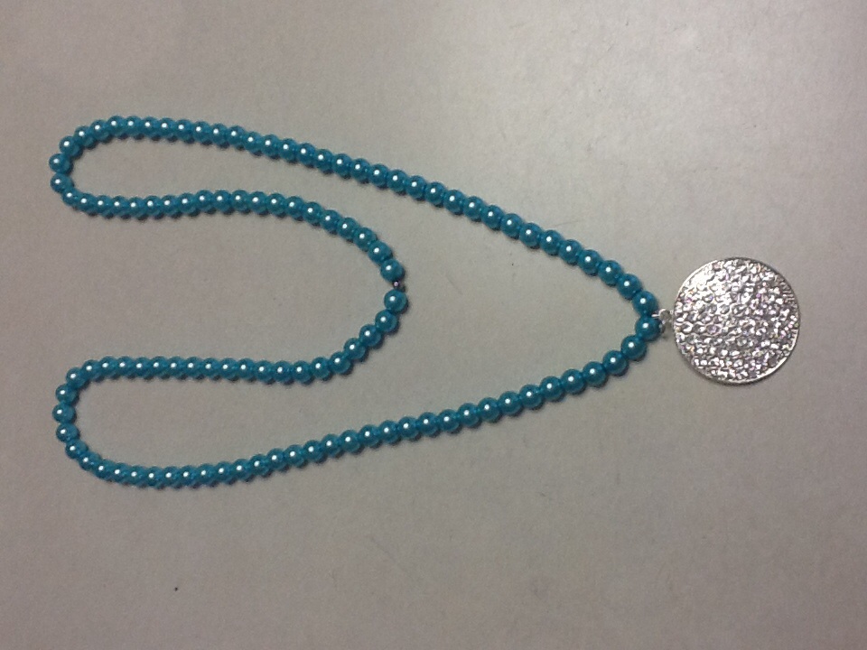38 inch long turquoise pearl necklace with large circle bling pendant