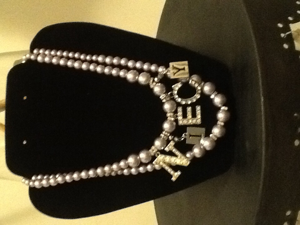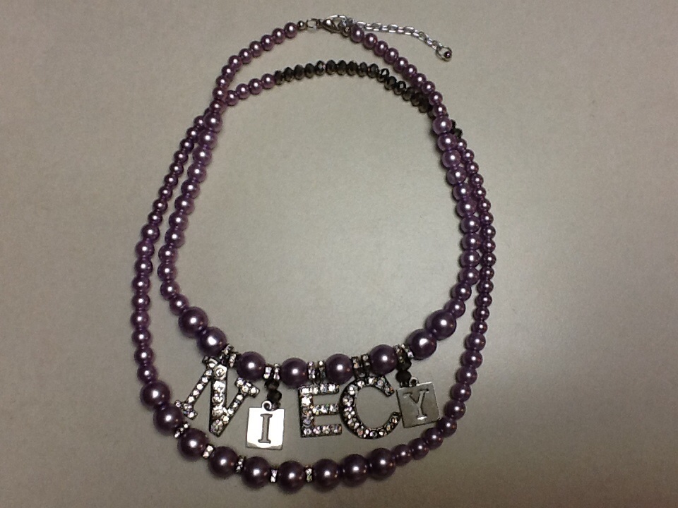 Lavender pearl and silver necklace with bling letters. Second necklace lavender and silver. Please leave preferred name during checkout (up to five letters).
