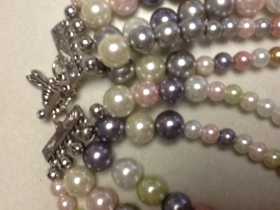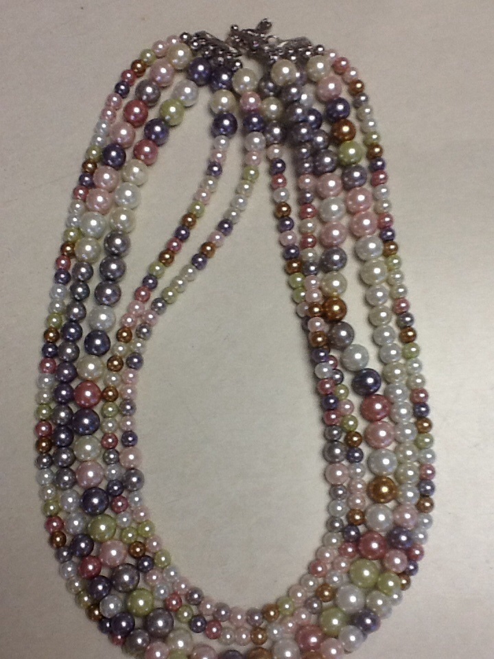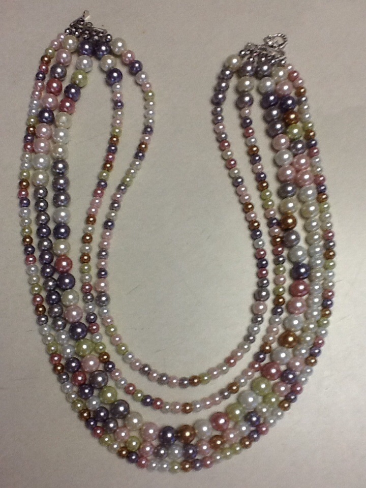 Five strand silver,gold,cream,pale pink, mauve, pale green pearl necklace with dragon fly clasp (23 inches).