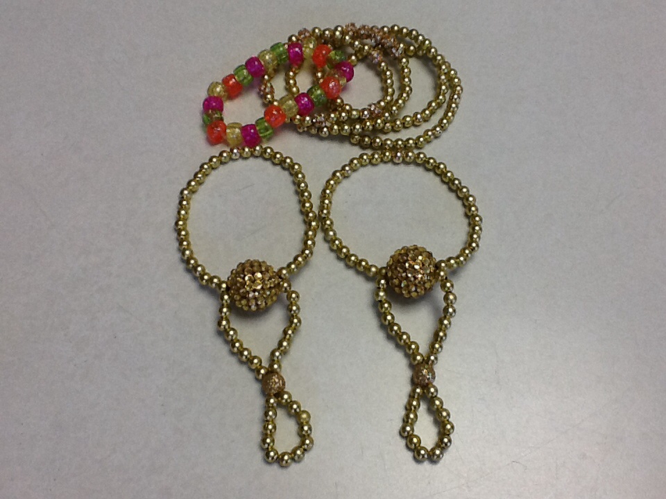 Four gold beaded bracelet with one colorful bracelet. Gold beaded footless sandals. Perfect for girls 3-6 years old.