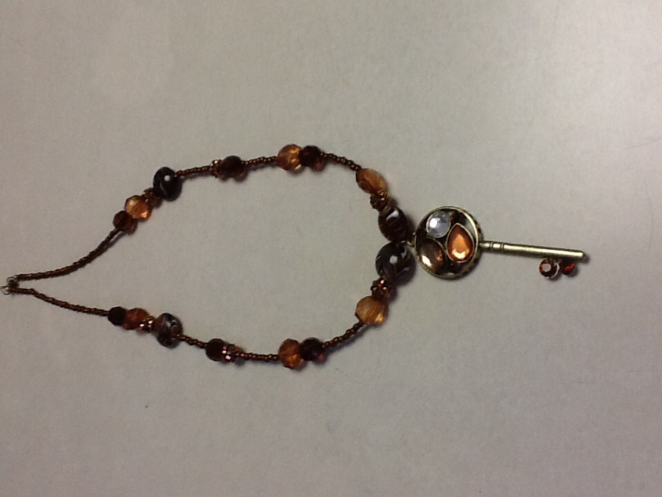 28 inches long brown and copper colored beaded necklace with key pendant.