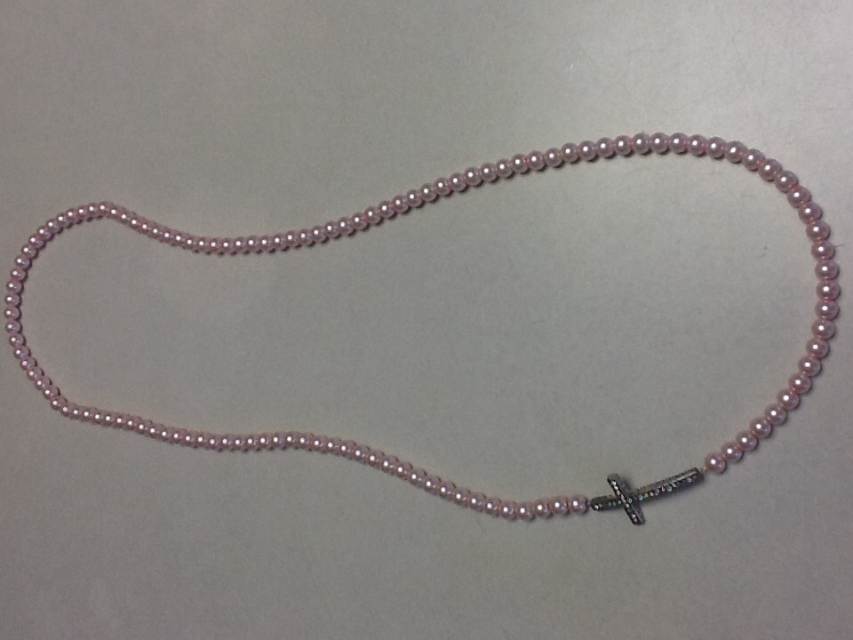 38 inch long pale pink pearl necklace with 2 inch bling cross.