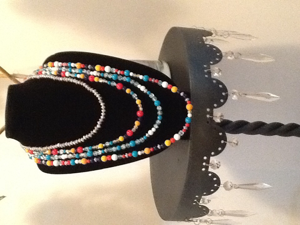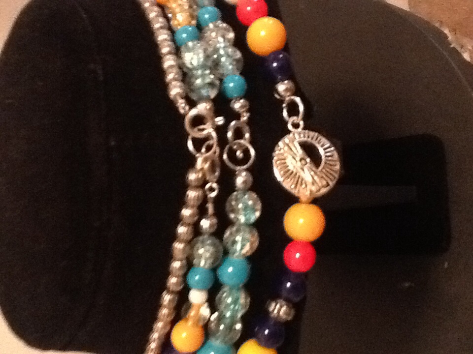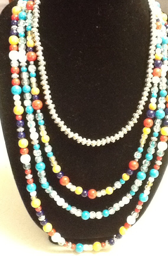 Four muti colored beaded necklaces with clasps: in different sizes.
