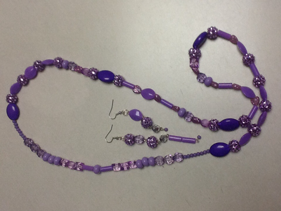 32 inch purple beaded necklace: purple beaded earrings.